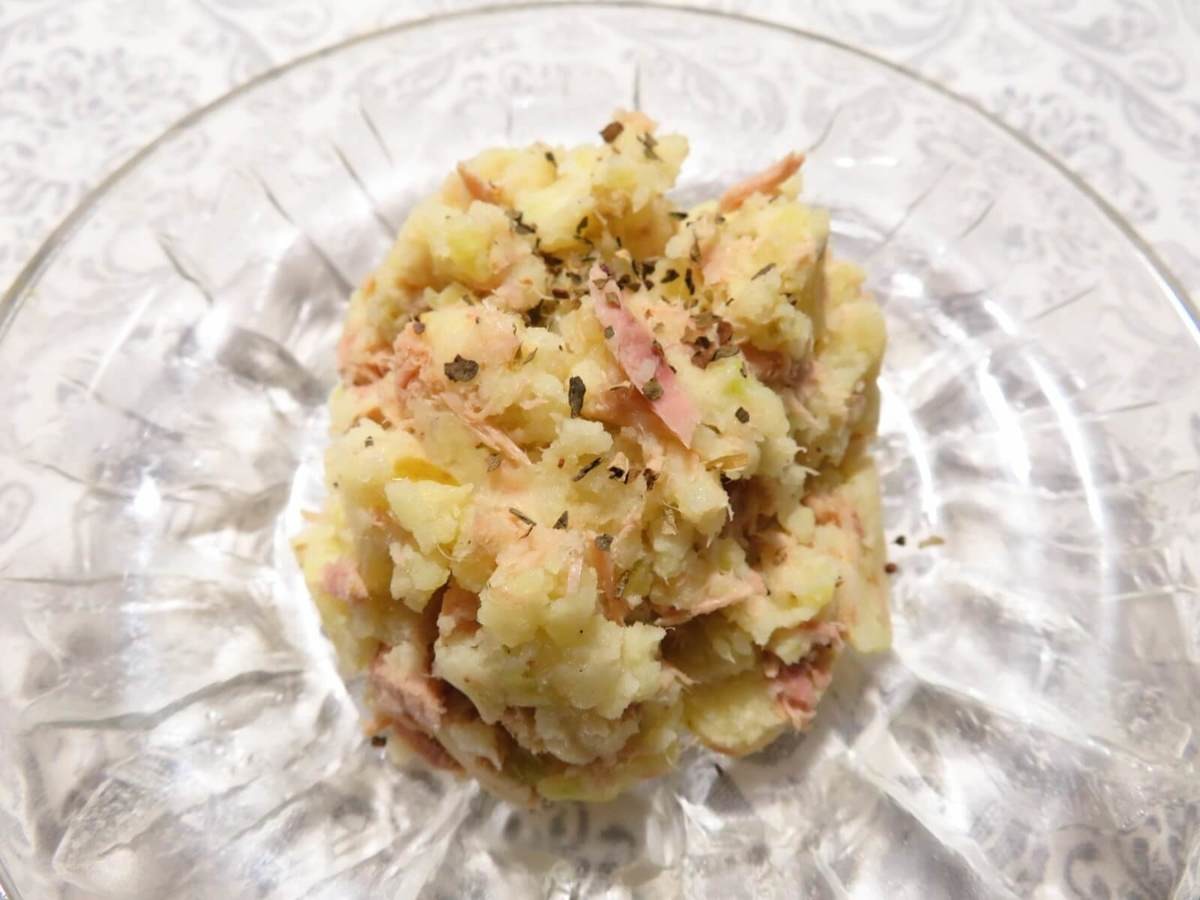 ②皮をむいたらマッシャーやフォークで潰し、水気を切ったツナ缶(1缶)、マヨネーズ(大さじ1~2)、「ブルスケッタ ザク切りオリーブ」(大さじ2)を入れて混ぜます。