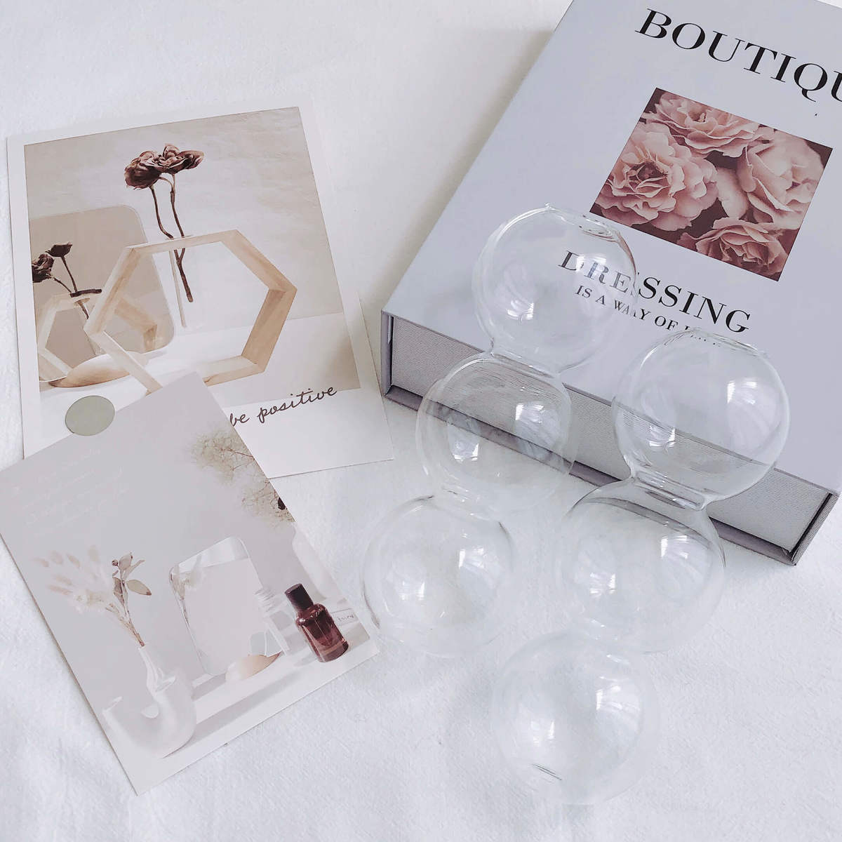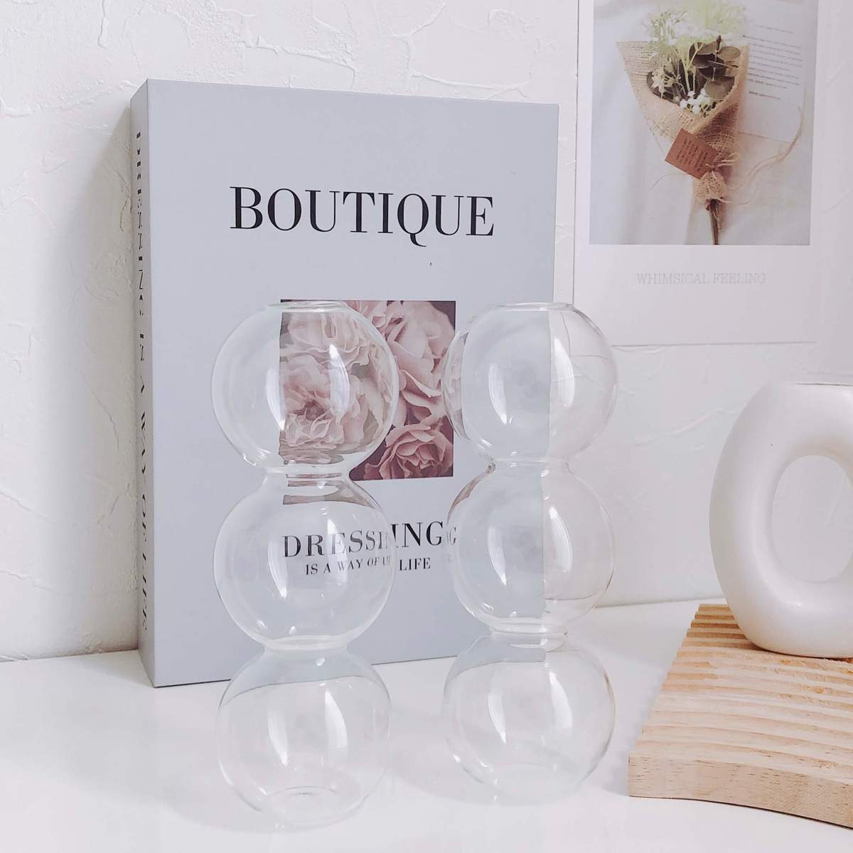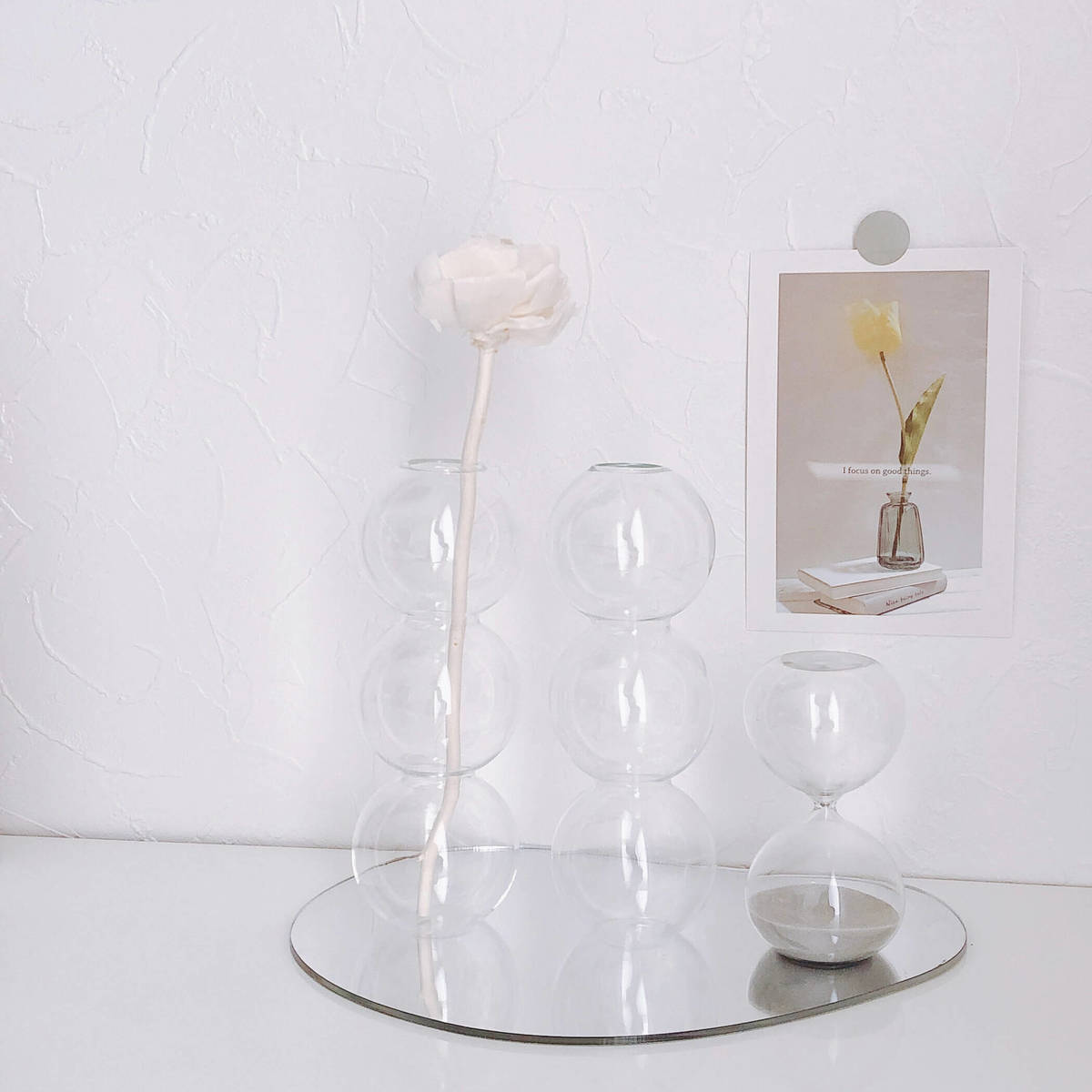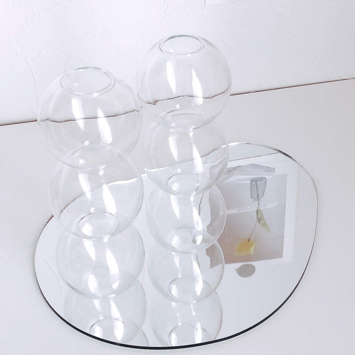 無機質できれいなクリアなので、ただただ並べるだけでも素敵にキマります。バブルガラスベースを2、3個並べるのも、圧迫感なくおしゃれでおすすめです。
