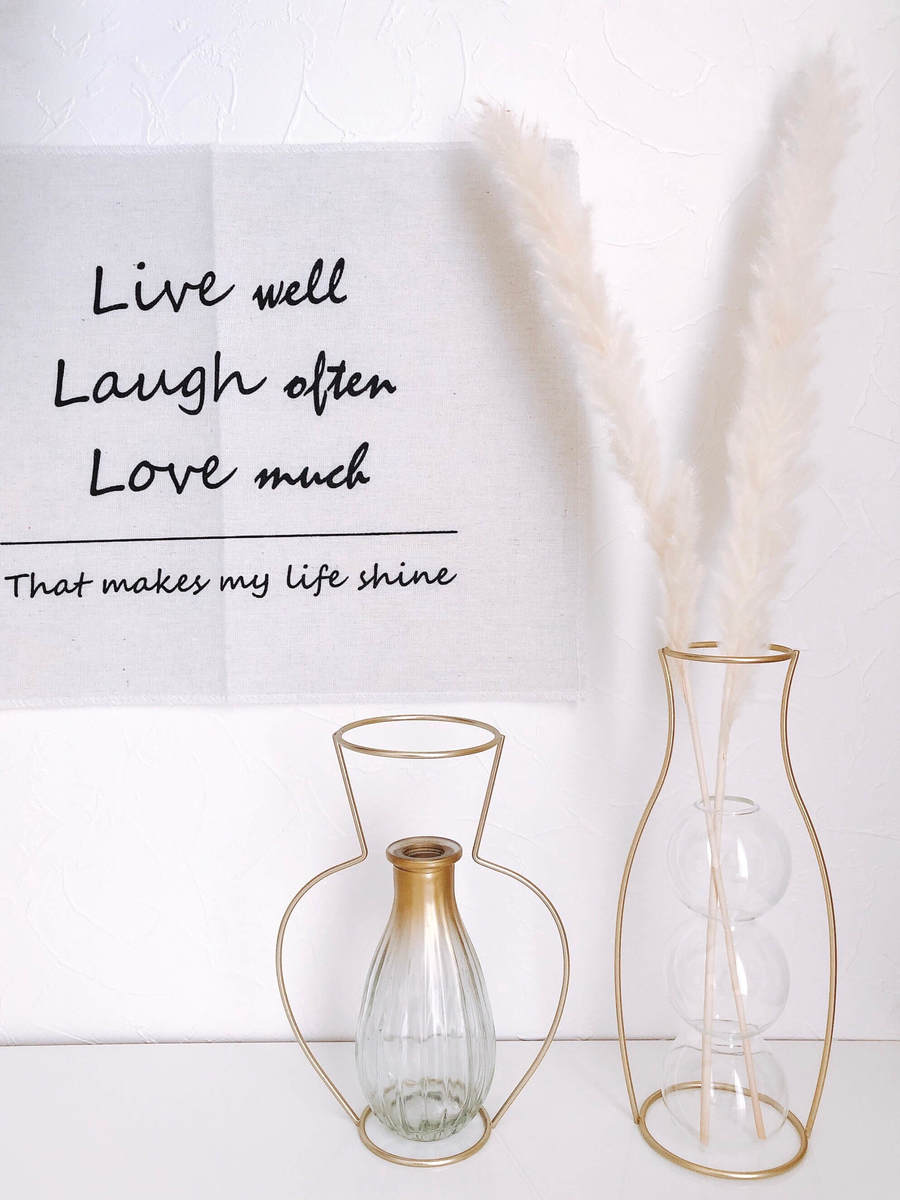 他にもダイソーのワイヤーベース(ゴールド)と組み合わせたり、おしゃれインテリア代表(?)のパンパスグラスを飾っても、間違いないですよ。