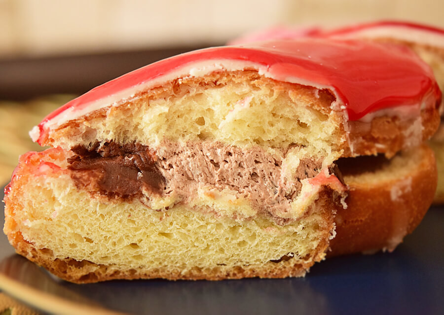 ガナッシュクリームとガナッシュホイップが入っています。真っ赤っかなドーナツなので、ベリー系統の味がするかと思いきや、わりとおとなしめなチョコレートの味わいとふわっと香るフランボワーズの甘酸っぱさがするドーナツでした。