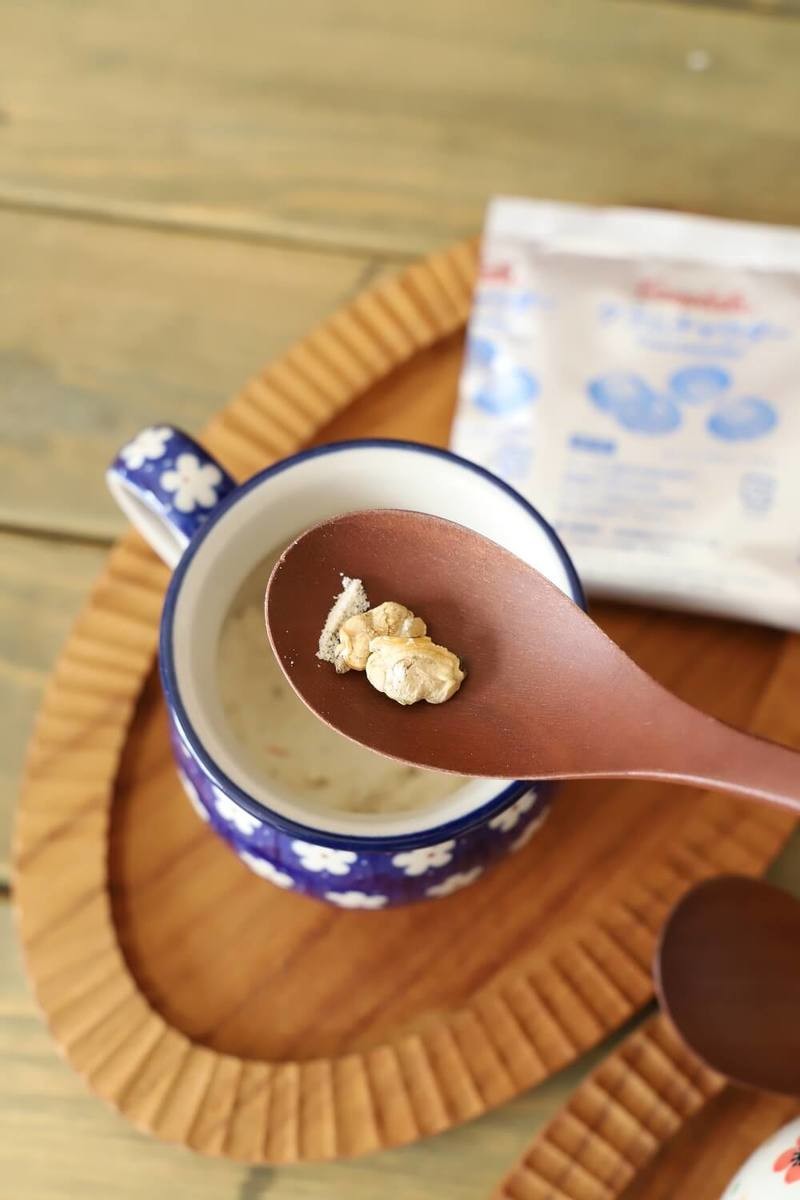 とろみがあり、なめらかでコクも感じます。パンを細長くカットして浸していただくのにもピッタリ。 コーンポタージュは一気にお湯を入れると少々だまになりやすいので、以下の方法をお試しください!