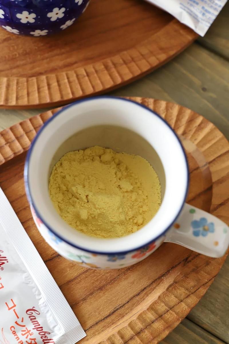 1)コーンポタージュの粉が入ったマグカップに湯大さじ2ほど入れよく混ぜる。