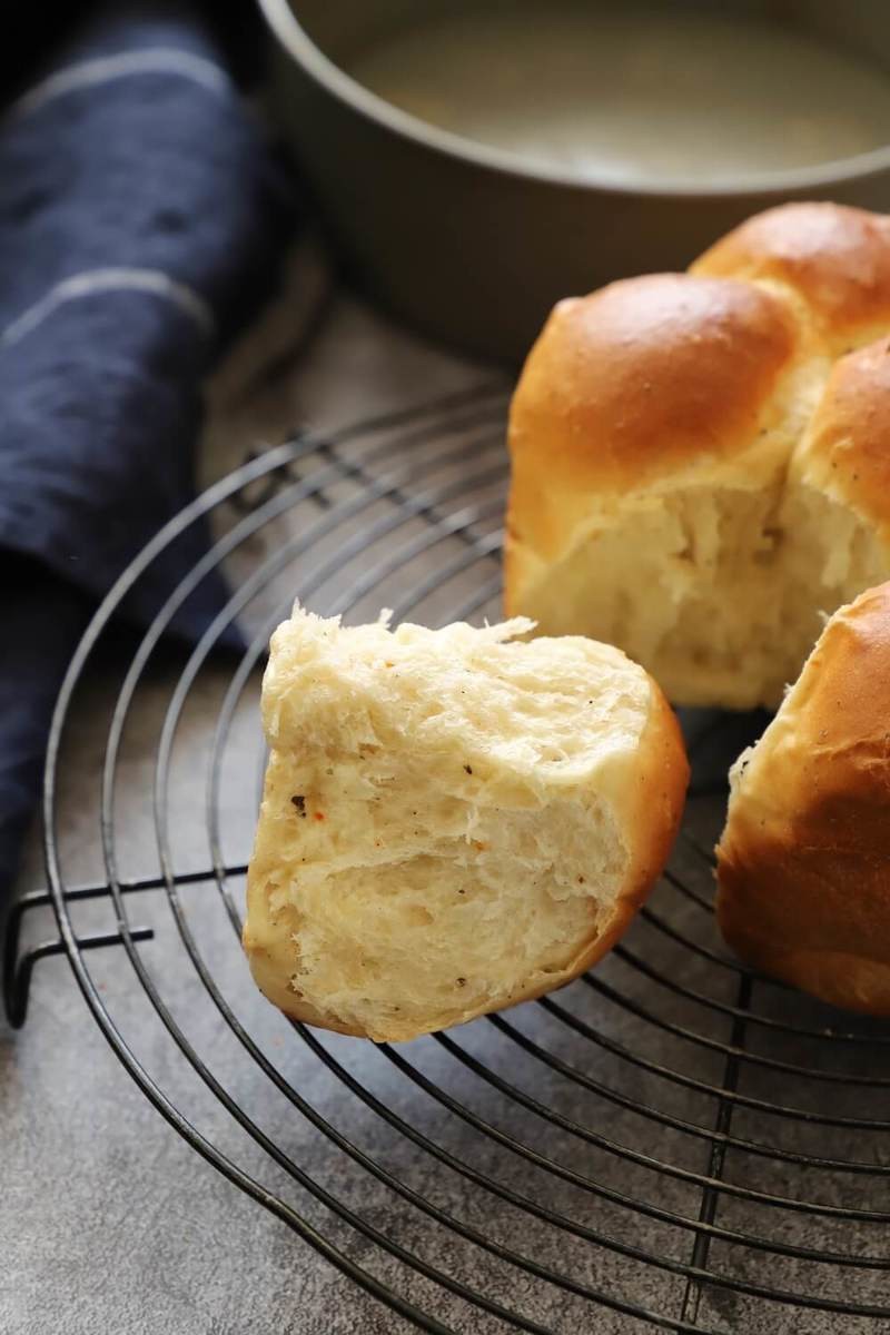 バターなど何もつけなくても、クラムチャウダーの風味のいいパンで優しい味わい。ベーコンとも相性バツグンです。
