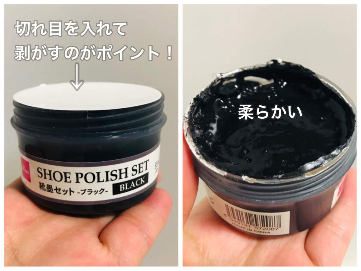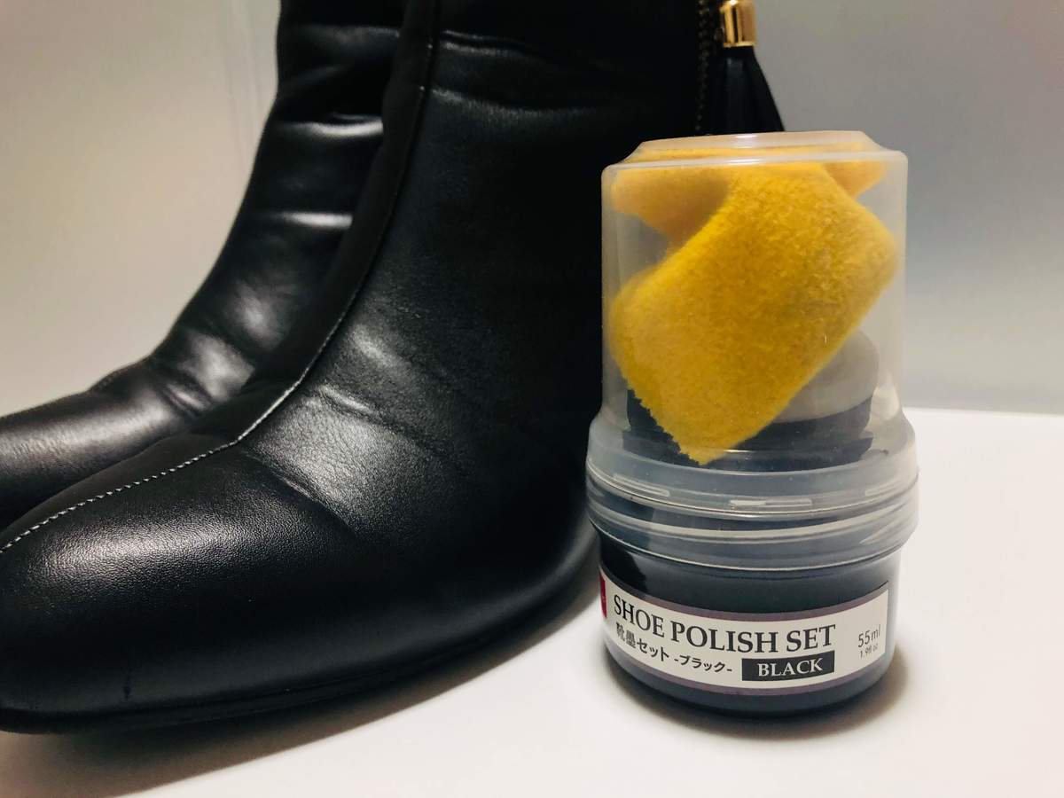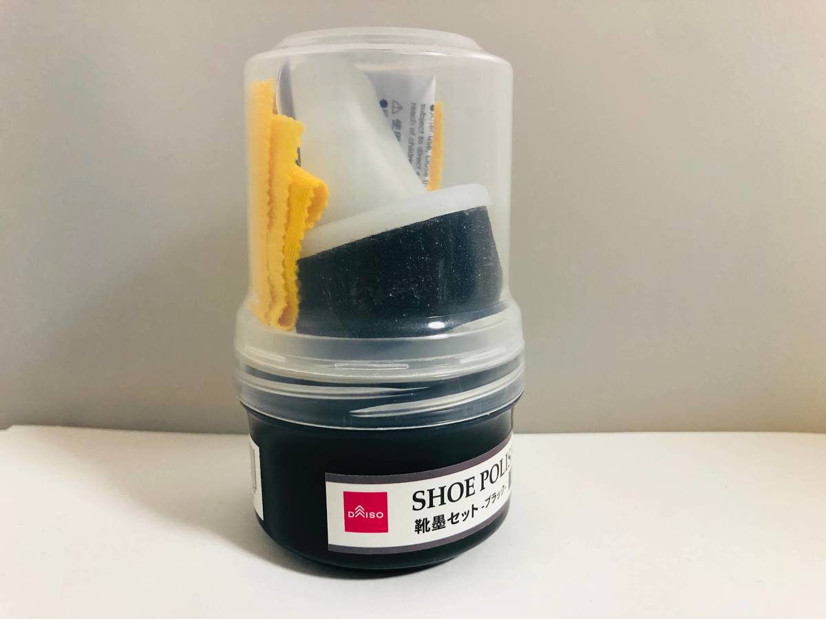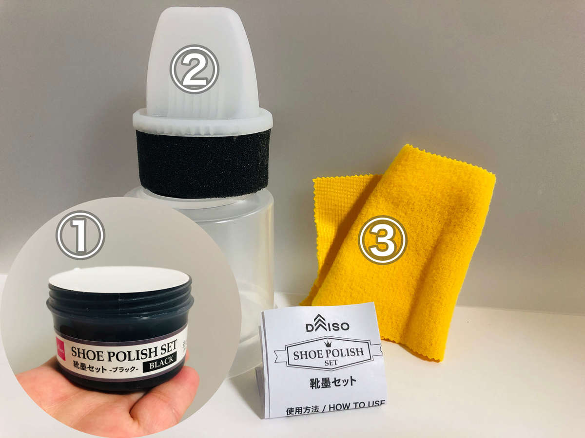こちらは、ダイソーで購入した「靴墨セット・ブラック」(110円 税込)。水をはじきホコリも付きにくくなるうえ、摩擦で出来た傷も隠してくれる優れもの!