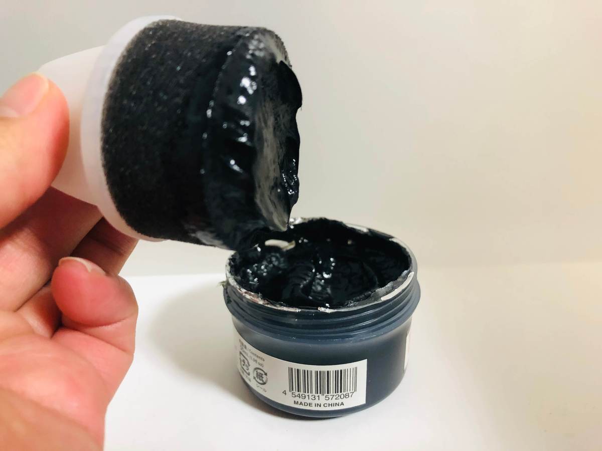 付属のスポンジを使ってクリームを塗り込んでいきます。クリームはとてもやわらかく、たくさん付いてしまうので要注意。
