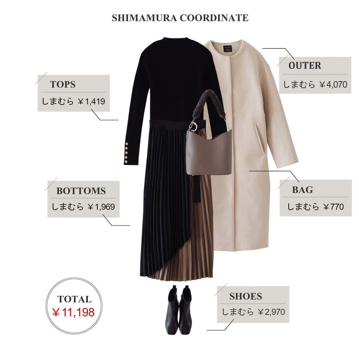 アウター、バッグ、靴は黒で、コーデ全体を引き締めました。