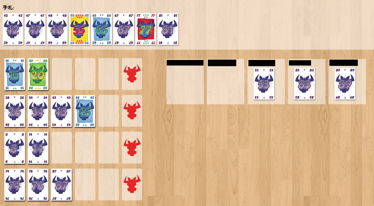 カードは1列につき5枚までしか並べることができないため、6枚目のカードを出して列をバーストさせたプレイヤーが減点のペナルティを受けます。