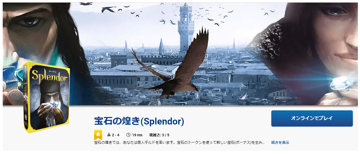 中世ヨーロッパのルネッサンス時代の宝石商人となって名声を得るのが目的の経営型戦略ゲームです。プレイヤーは自分の手番で「宝石トークンの獲得」、「発展カードの購入」、「貴族タイルの取得」などを行い名声ポイントの獲得を目指します。