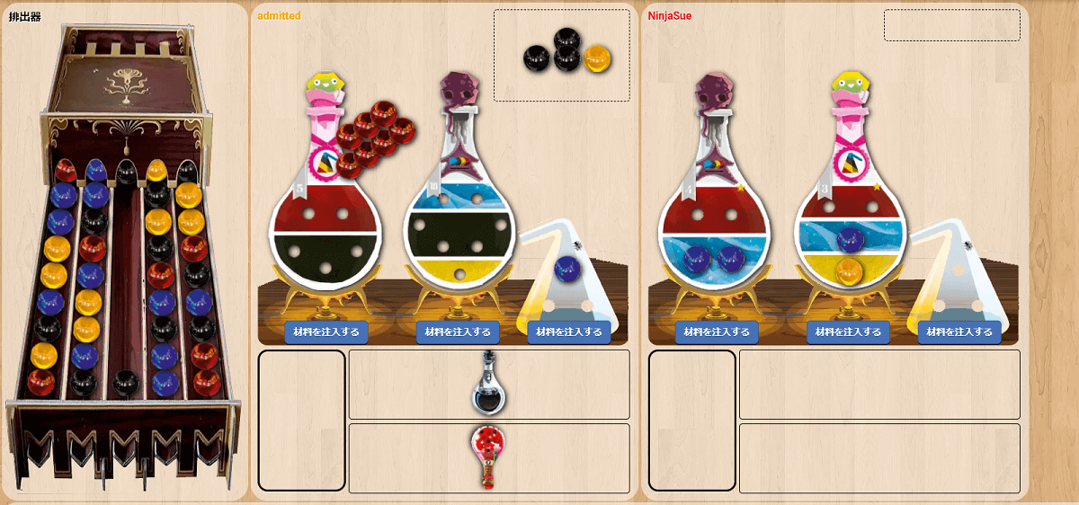 魔術学校の生徒となって、最終試験として課せられた魔法の薬を作成するのが目標のセットコレクションゲームです。画面左側の排出器から薬品の材料となるビー玉を取り出し、フラスコ内の薬品タイルにセットしましょう。薬品を完成させることで技能トークンが手に入ります。