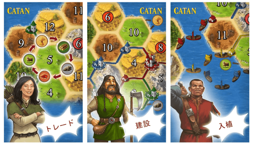 | ゲームの魅力 | ダイスロール、陣取り、資源の交渉とボードゲームの色々な要素が入っています。ボードゲーム初心者には少しハードルが高いのですが、回数を重ねる毎に深さにハマってしまう面白さがありますよ。 |