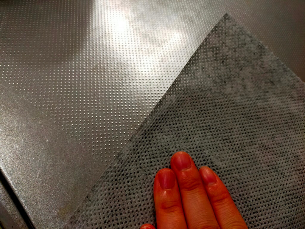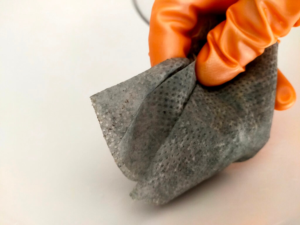 こちらの商品、見た目はグレーのキッチンペーパーみたいな作りなんですが、明らかに違うのは手触り。ガサガサしていてある程度張りのある素材になっています。水や中性洗剤を使って使用するのですが、濡れても破けたりすることはありません。