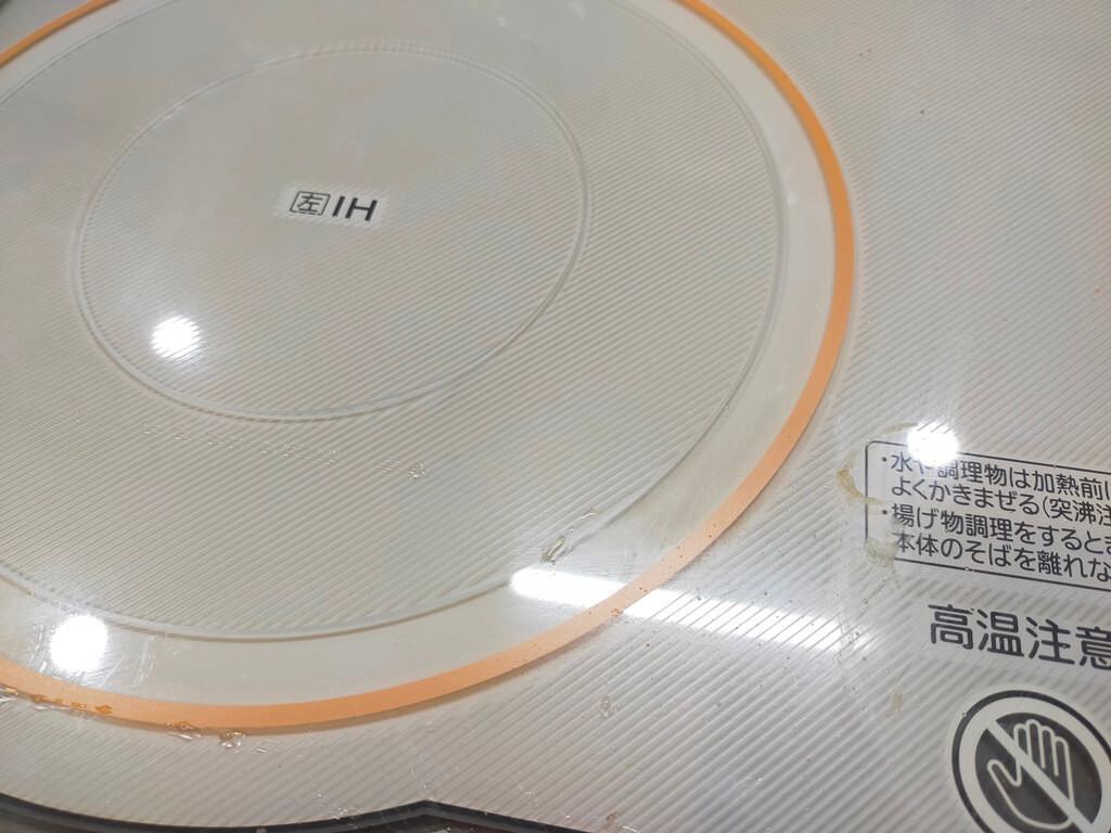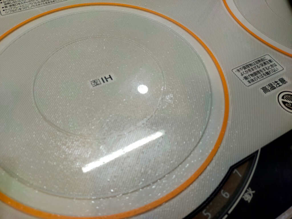 少し放っておくだけで汚れてくるIHのガラストップ。吹きこぼれてまわりも汚れていたのをきれいにしていきます。