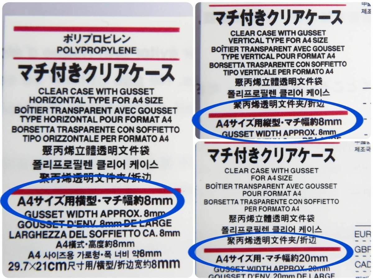 大きさは全てA4ですが、「横型・マチ幅約8mm」「縦型・マチ幅約8mm」「横型・マチ幅約20mm」の3種類があり、用途や好みに応じて選べます。