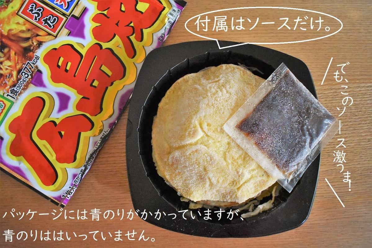 レンチン6分弱。付属ソースをぬれば、あっというまに「広島焼き」に。