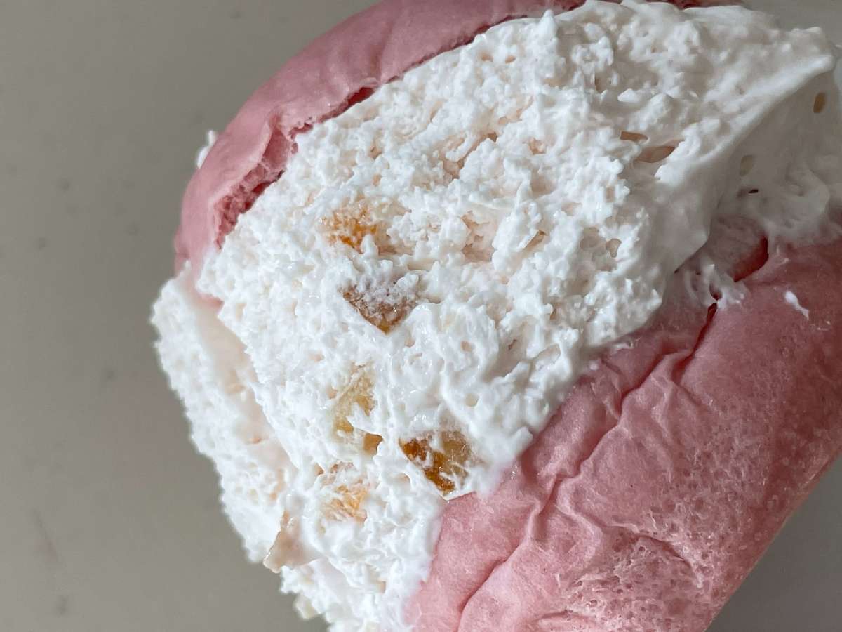 公式サイトを見ると、ストロベリーカラーのブリオッシュ生地に、オレンジピール入りホイップを挟んだマリトッツォだそう。