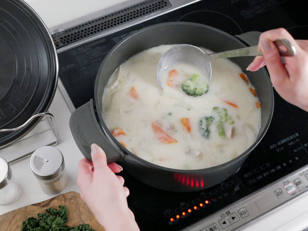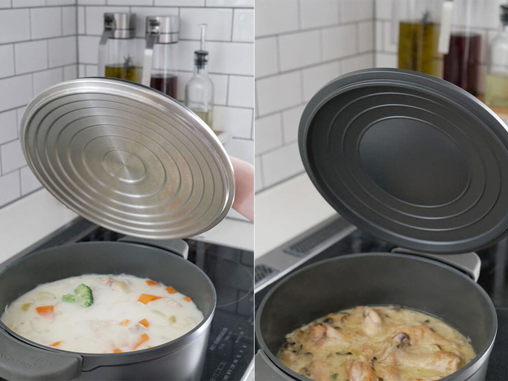 カレーやシチューはもちろん水分の多いお野菜なら無水調理ができ、ポットポークローストなど柔らかく仕上げる料理にも特におすすめ。