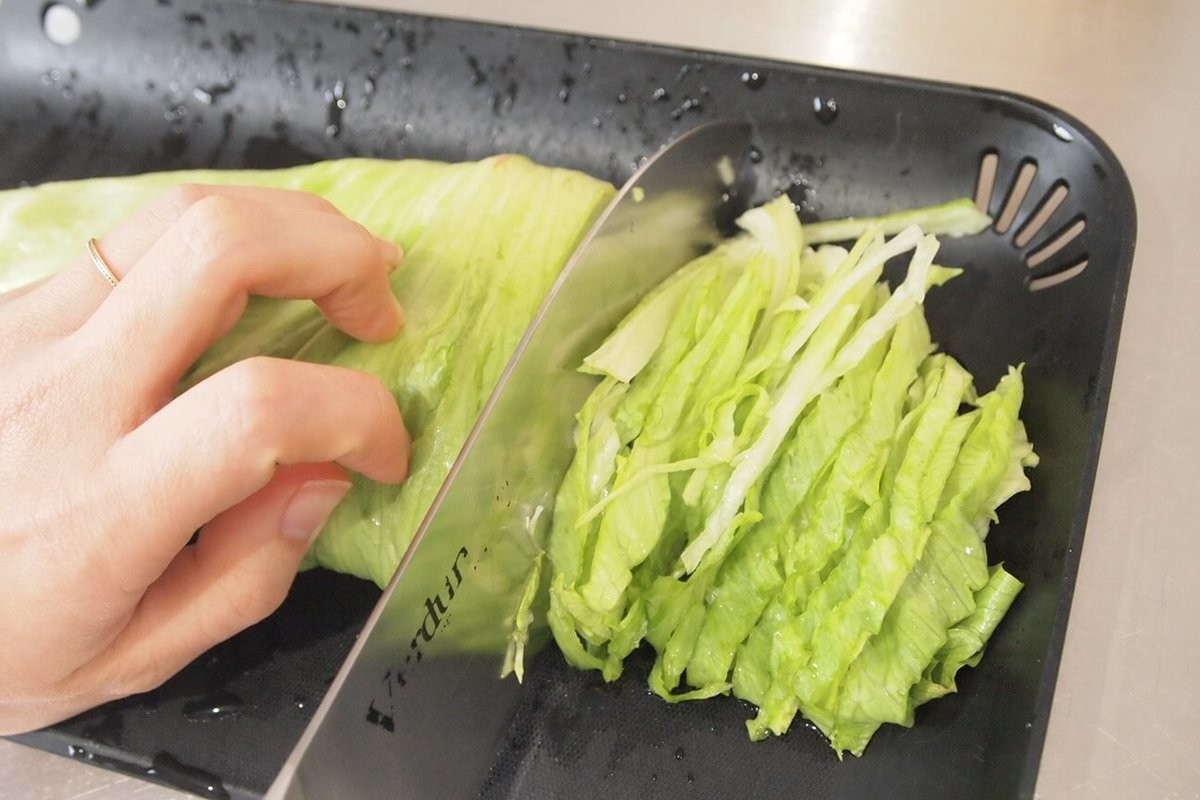 味噌汁を温めている間に、レタスを刻みます。重ねてクルクル巻くと、刻みやすいです。