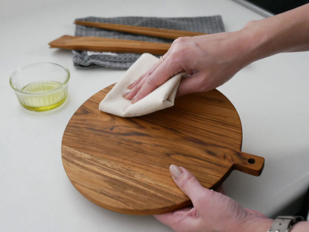 お手入れ方法は、ご家庭でお使いの食用のオイルを少々布に付けて表面を拭くだけ。 オリーブオイルやえごま油、亜麻仁油などが木材と相性が良く、お手入れの頻度は、10~20回ご使用ごとに一回が目安です。