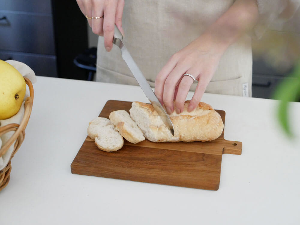 パンやフルーツ、チーズなどナイフで切り分けるのに◎。 そのままテーブルにだしても、チーク材の木目がナチュラルに食卓を彩ります。