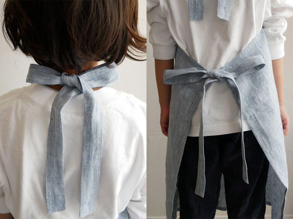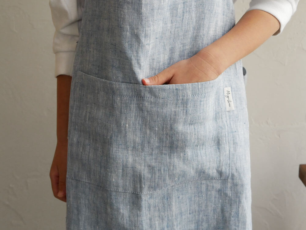 大人用と同様上質なリネンを使い、丈夫でお手入れも簡単。小さなヘルパーをスタイリッシュに、“親子でお揃い”が嬉しいエプロンです。