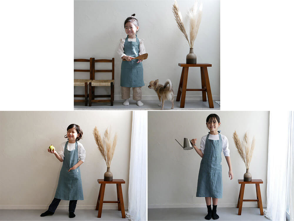 「リネンキッズエプロン」は大人用もあるので同じカラーでお揃いにでき、お料理中に写真も撮りたくなっちゃうほど、愛らしいシーンになりますよ。