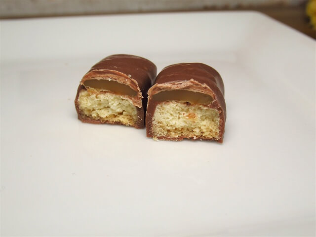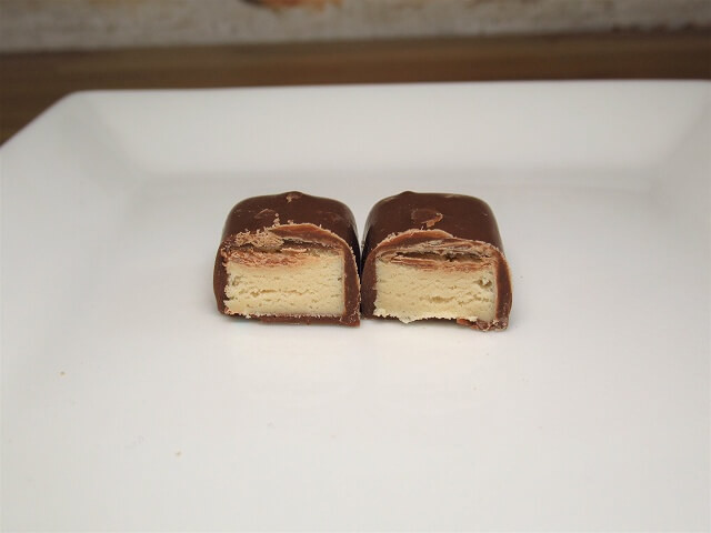 まずはビスケットから食べてみると、サクっとした食感のビスケットとは逆に、ヌガー・ミルクチョコレートは、歯にくっつくようなねっちょりした食感です。