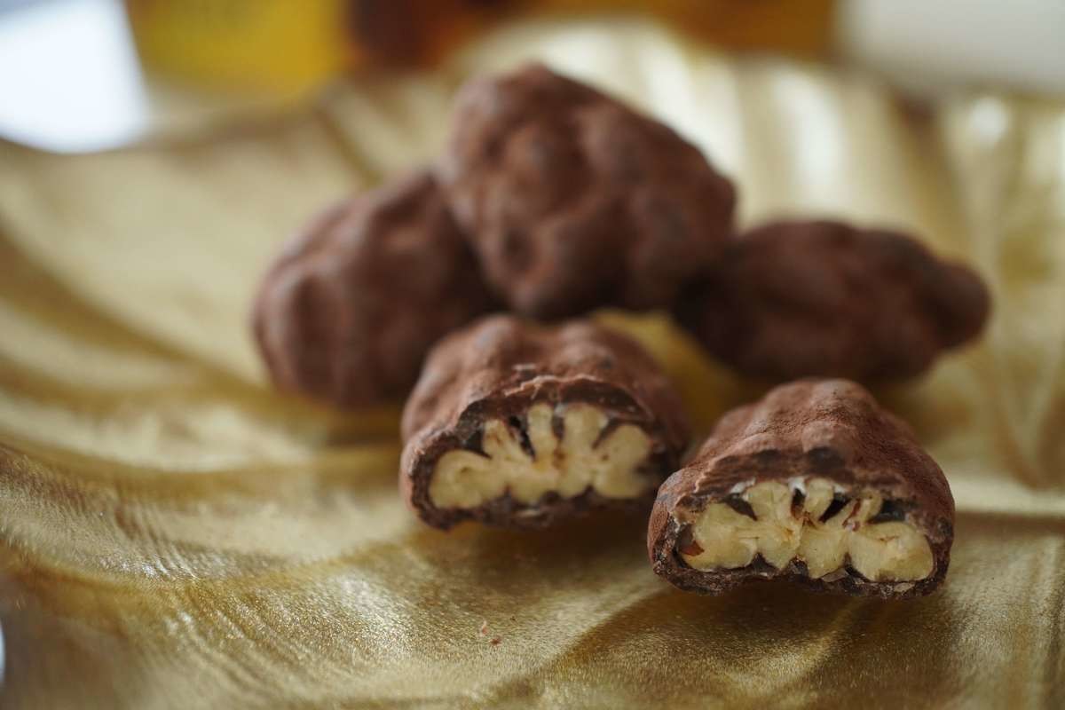 キャラメリゼしたピーカンナッツをミルクチョコとココアパウダーでコーティングしてあります。