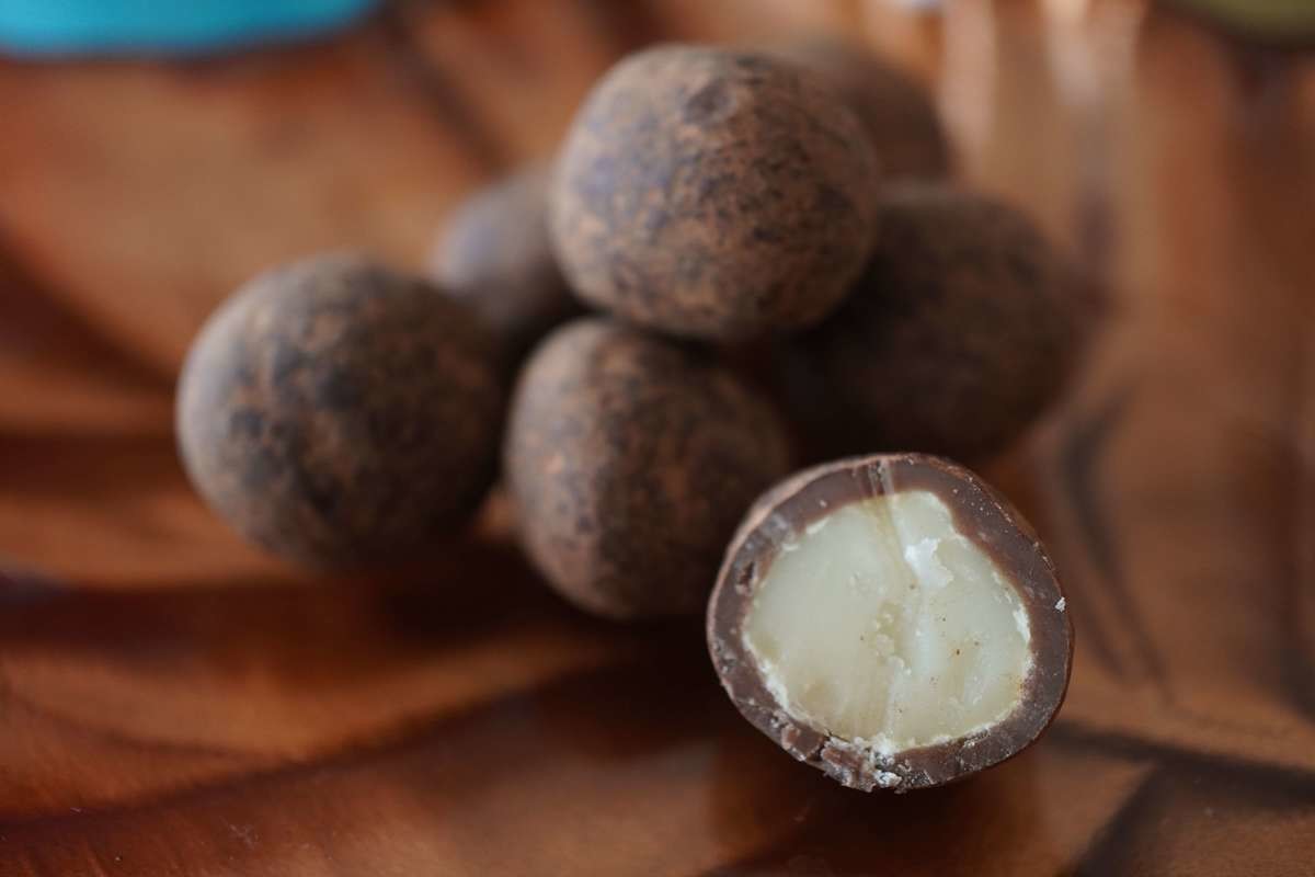 香ばしくローストしたマカダミアナッツをミルクチョコレートで薄く包んであり、ココアパウダーがまぶしてあるチョコレートです。