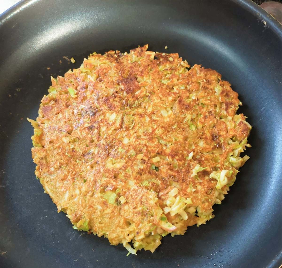 火の通りを考慮して厚さを出さなかったため、大きめのお好み焼きになりました。
