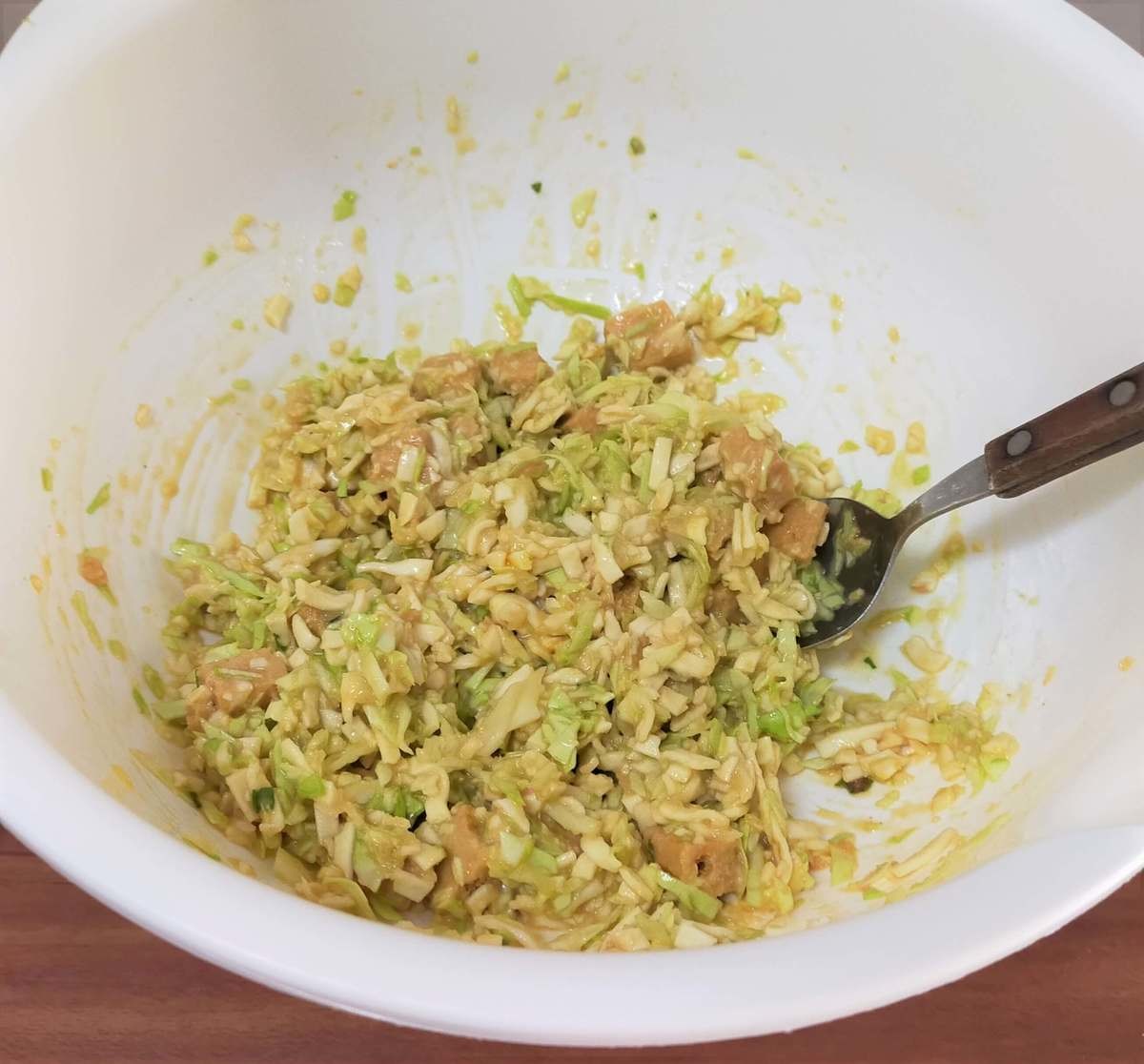 キャベツの水分量を考えたらこのくらいが丁度いいのかな?しっかりというよりは軽めに混ぜました。