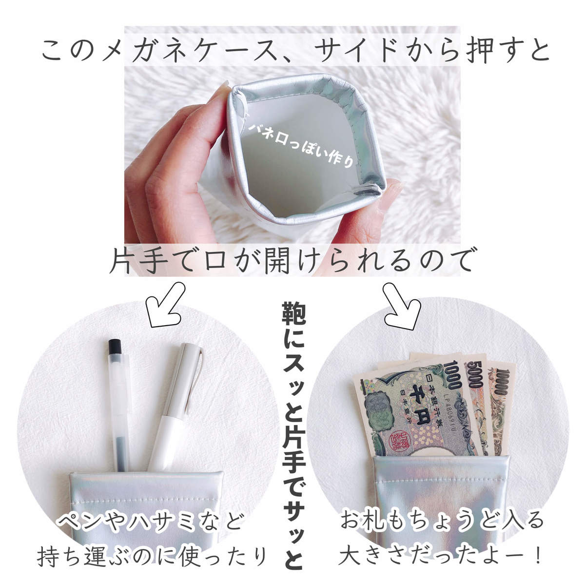 バネ口のような作りになっていて、両サイドから押すと片手で口が開けられるんです。