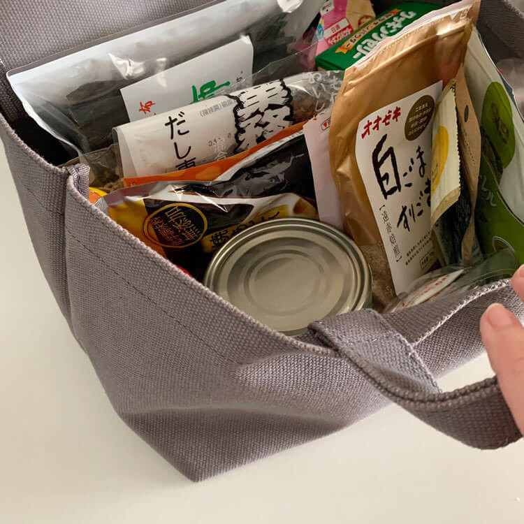 我が家はキッチンの引き出しが少ないので、こういった調味料系を片付けるのに収納トートバッグが大活躍です。