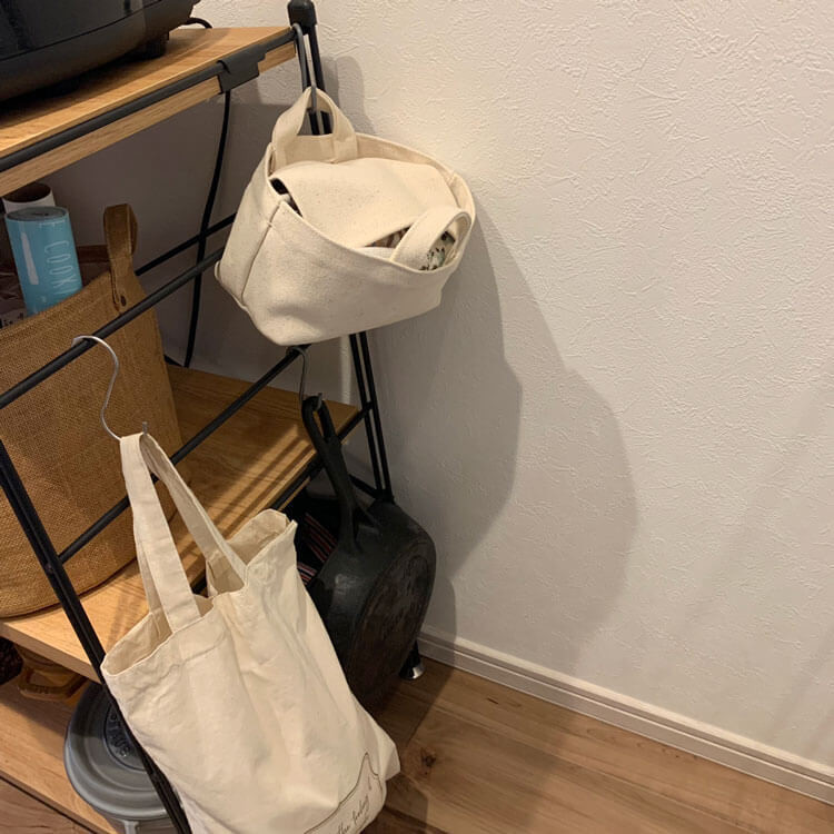 ラックにS字フックをかけて、収納トートバッグの持ち手を引っかけて使っています。