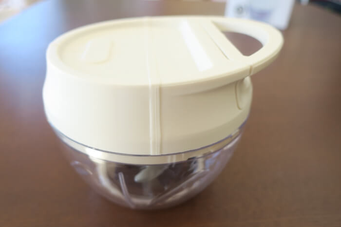 切りたい野菜をざっくりカットして容器にセットし、ハンドルをひっぱるだけでみじん切りができちゃうんです。ひっぱる回数によって細かさが調整でき、力を使わなくてもOK。電源につなぐ必要がないのも嬉しい、そして価格がなんと330円という、最強グッズです!