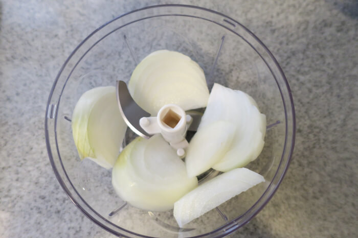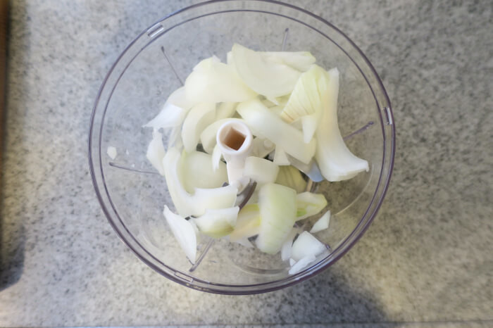 ボウルにカッター下部の丸い穴がはまるようにセットし、カットした食材を入れます。(容器の半分以下まで) これで、玉ねぎ1/4〜1/2個。分量やサイズは、小さめの電動のハンディチョッパーと同じくらいです。