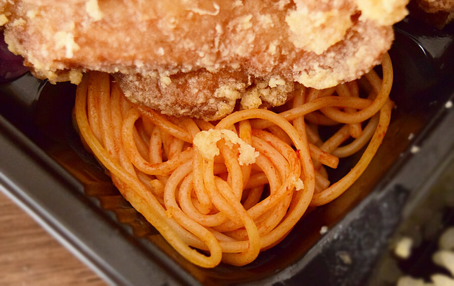 そんな唐揚げの下には、ケチャップ味のパスタ。
