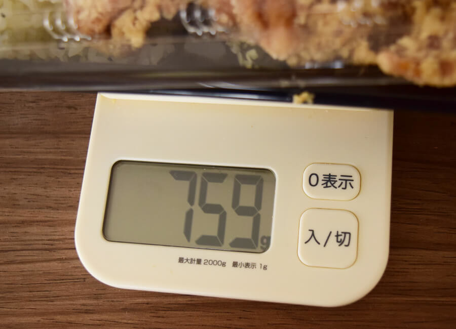 気になる重さは、759g。私はこれまで1キロ弁当買い過ぎてるため感覚がバグっていて「なんだ1キロもないじゃないか」と思ってしまいましたが、デカ6も重量級のお弁当です。ひとりで食べ切るのは無理......。