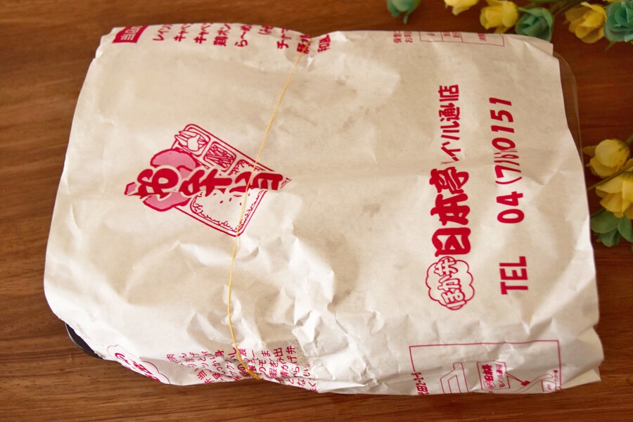 利用店舗へお持ち帰り予約の電話をした際「貴店でいちばん重さのあるお弁当ってどれですか?」と尋ねたところ、出てきたのが「デカ6」950円(税込)。紙袋に包まれた状態で提供されました。