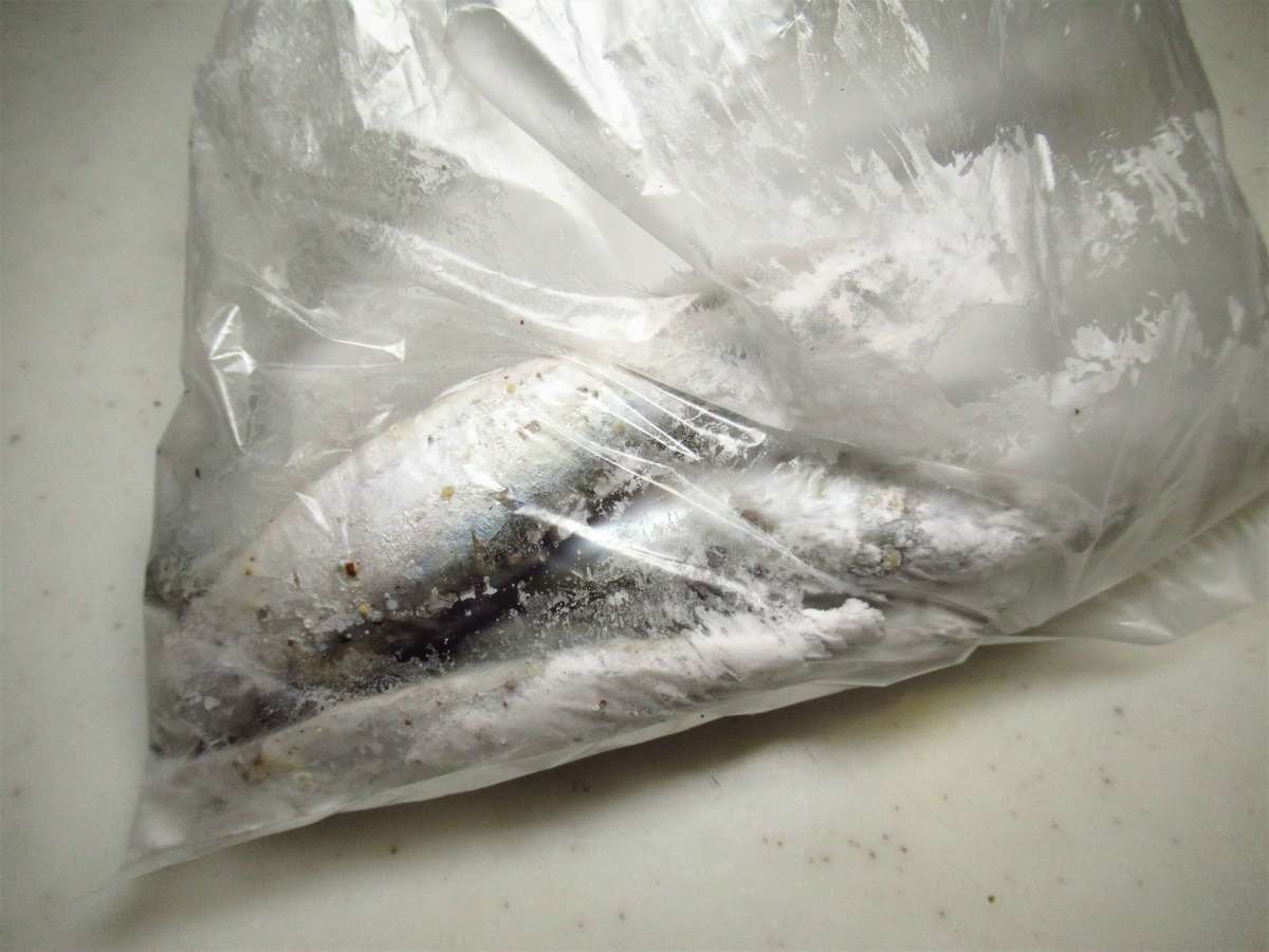 2.少し強めに塩コショウをしたバルト海いわしと片栗粉をナイロン袋に入れる