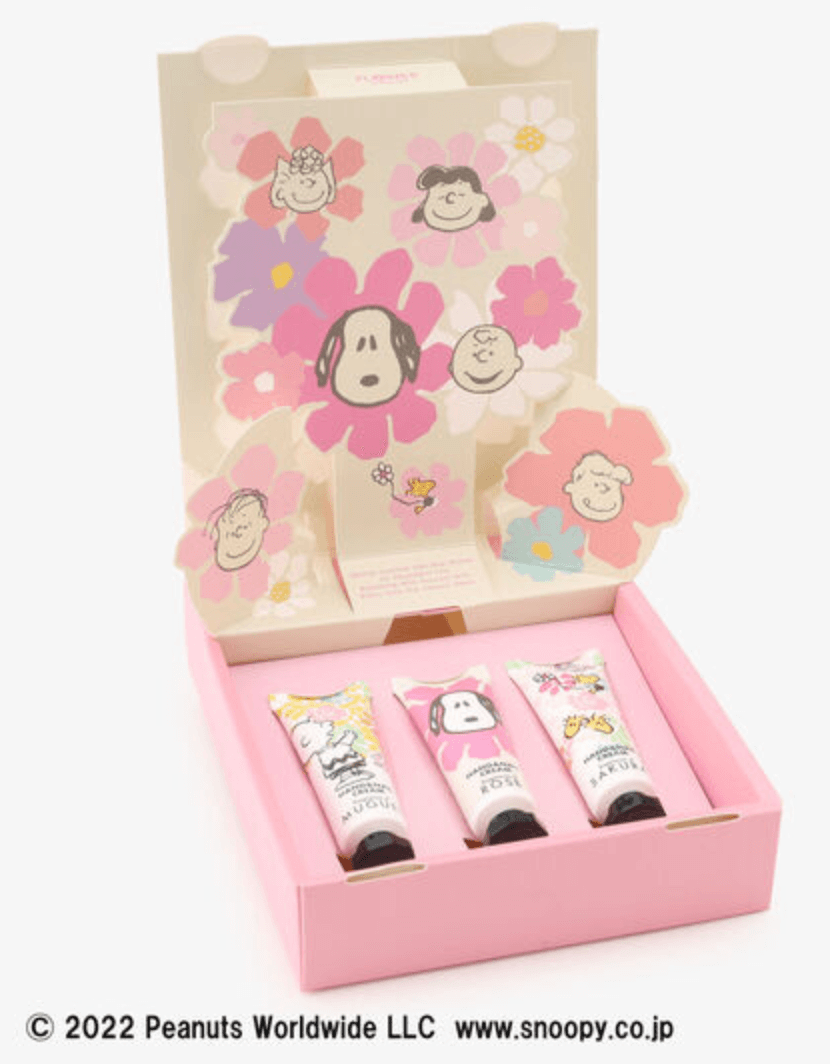 もう少し予算を抑えたいという方は、ハンドクリーム3本セットがおすすめ。箱を開けると、「PEANUTS(ピーナッツ)」のキャラクターたちが出迎えてくれる、楽しさ満点のポップなデザイン。