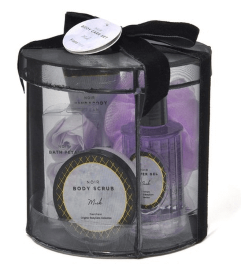 ボディウォッシュ、バススポンジ、ボディスクラブ、ボディクリーム、バスフィズがはいったお得なセット。いろんな世代の方に受け入れられやすい香りです。
