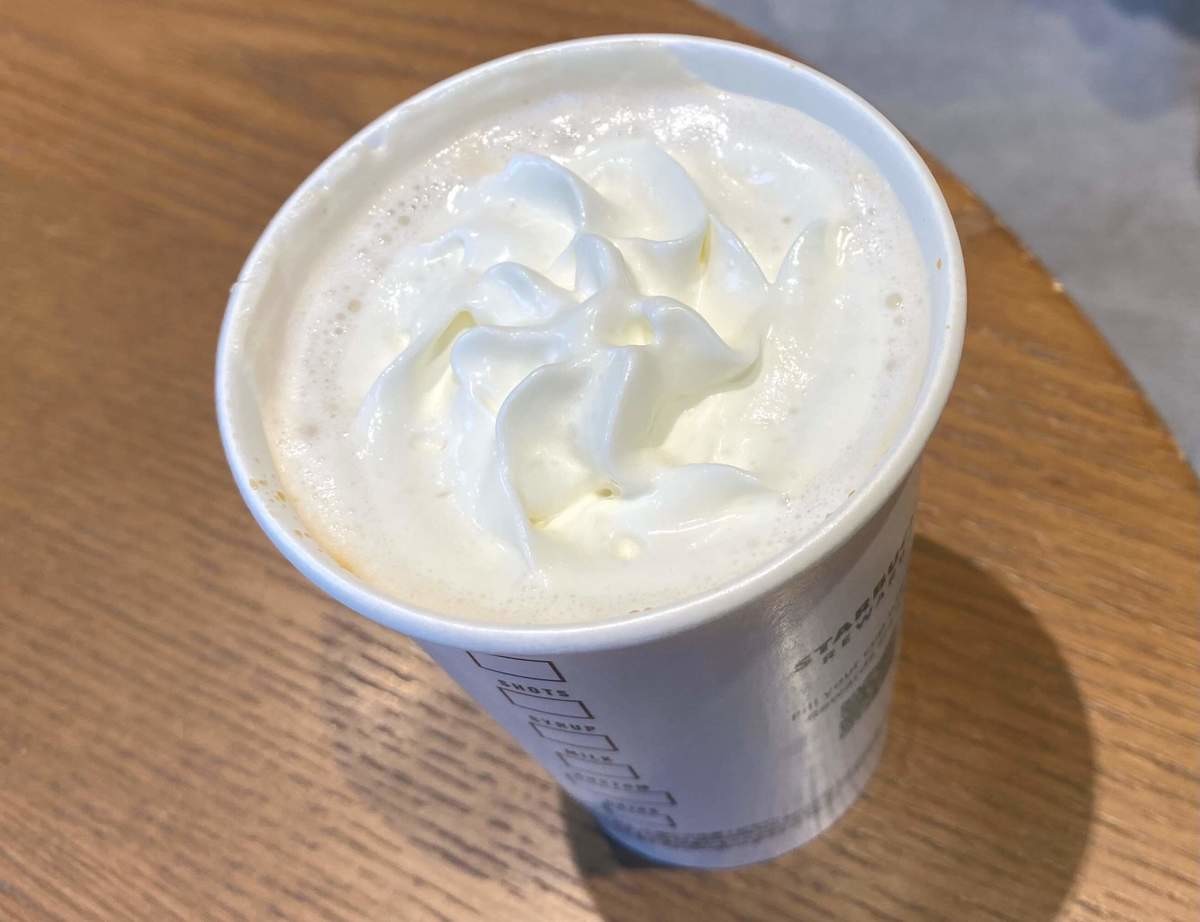 カスタマイズ好きの筆者としては、かなりシンプルなカスタマイズなのですが、こちらかなり計算され尽くしたドリンクなんです。最初はホイップクリームとキャラメルソースの贅沢なコラボを。最後はキャラメルの風味とホワイトモカのまろやかさと、豆乳のさっぱりとした味わいが楽しめます。