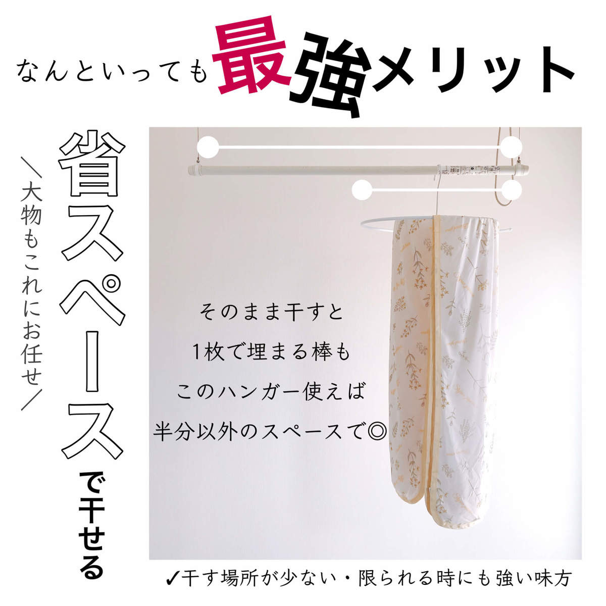 なんと言っても最強のメリットは、省スペースで干せること!そのまま干すとこの1枚で埋まってしまう物干し棒も、このハンガーを使えば半分以下のスペースで干すことができます!か、感動……!