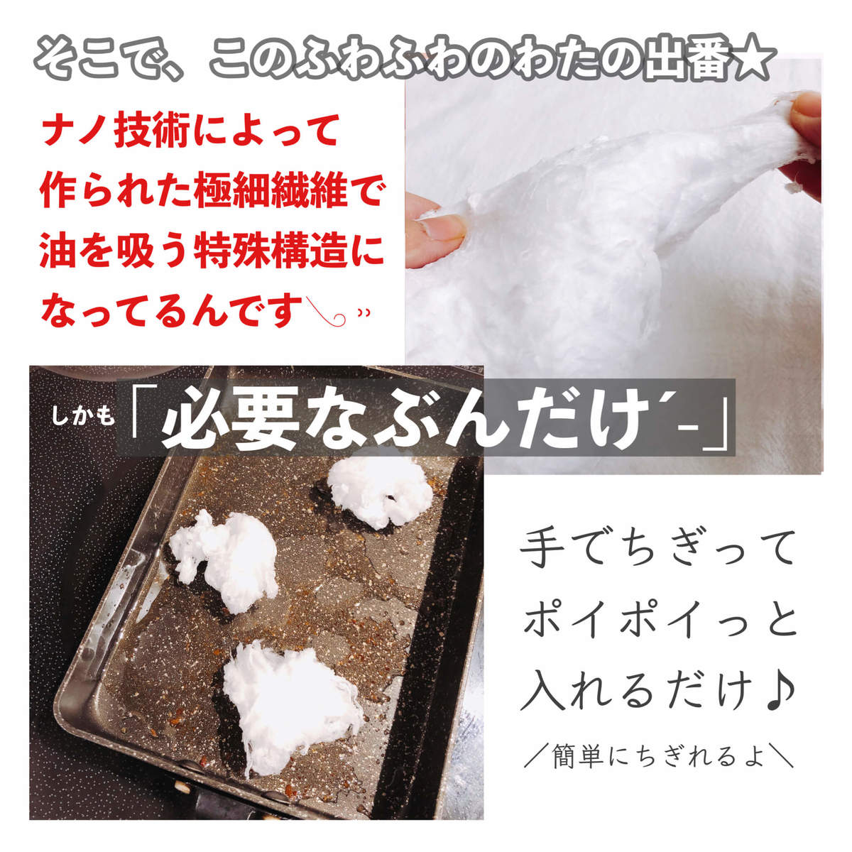 ぐんぐん油を吸収してくれます。少量のわたでしっかり吸い上げてくれるので、後処理も洗い物も、一気にラクになる救世主です!