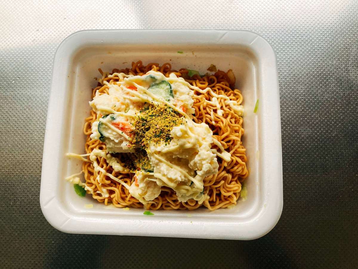 出来上がった一平ちゃんに、ポテトサラダ、付属のふりかけ・からしマヨネーズをかけます。 これで完成です!