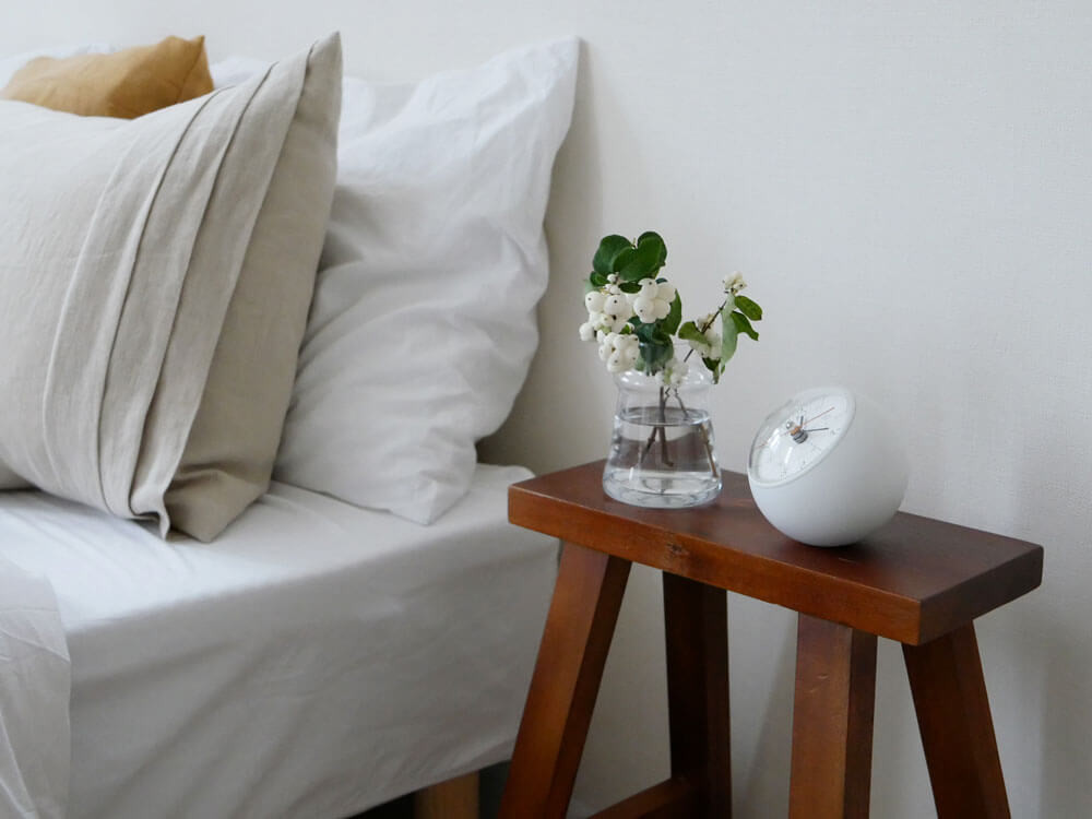 リラックスタイムを邪魔しない静かなスイープムーブメントを使用しているから、寝室や書斎にも最適。 針の動きは音もなくなめらかなので、枕元に置いても気になりませんね。