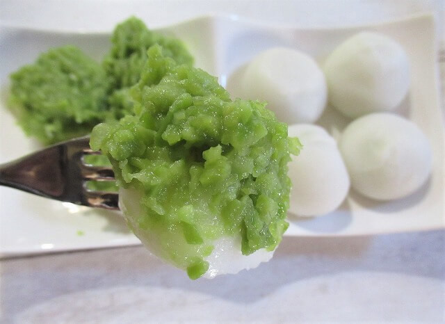 業務スーパーのずんだ餅と、比べてみると色の濃さはセブンのほうが濃いですね。