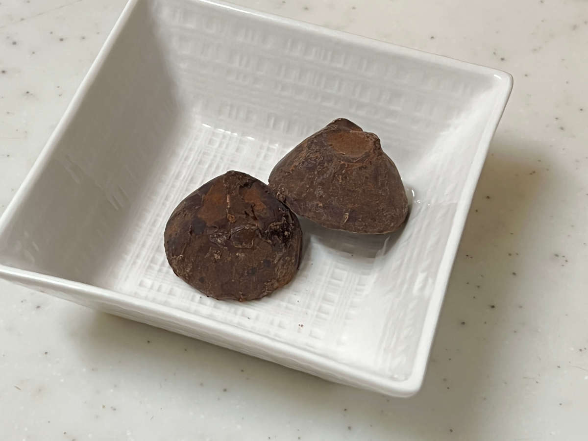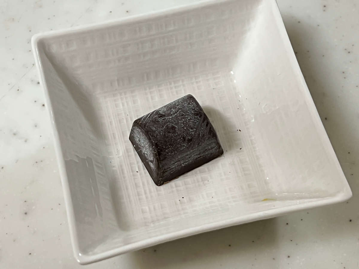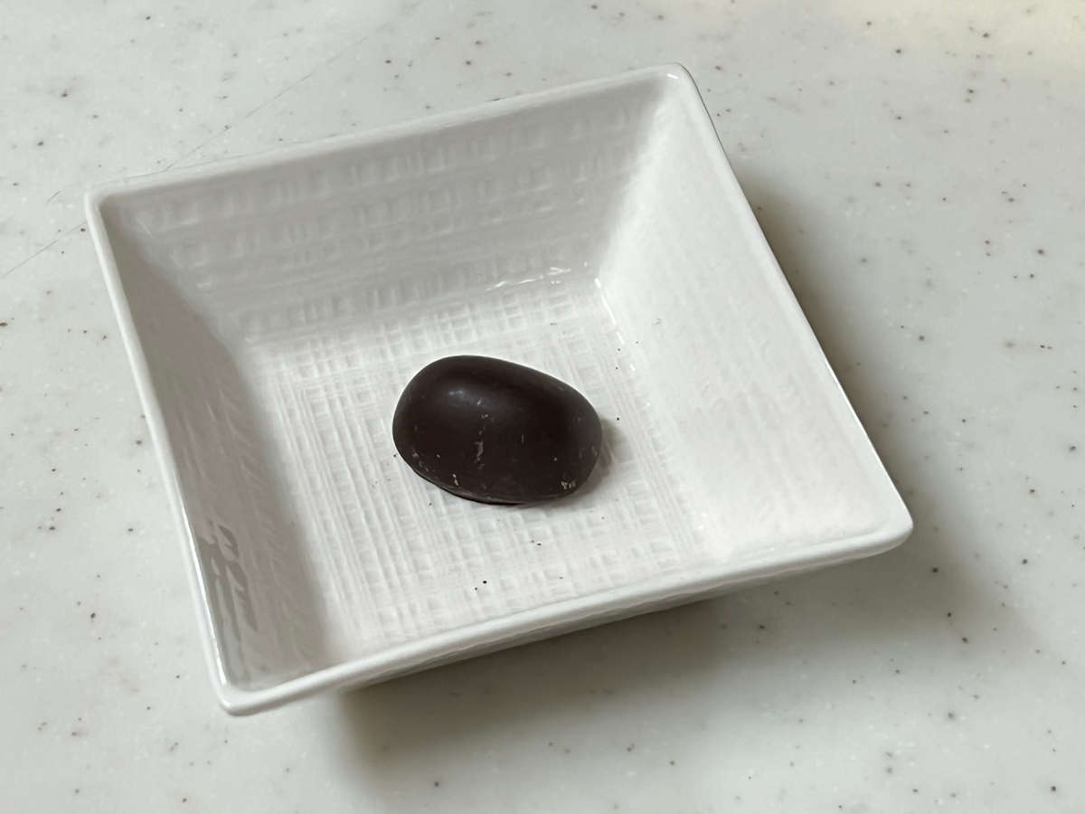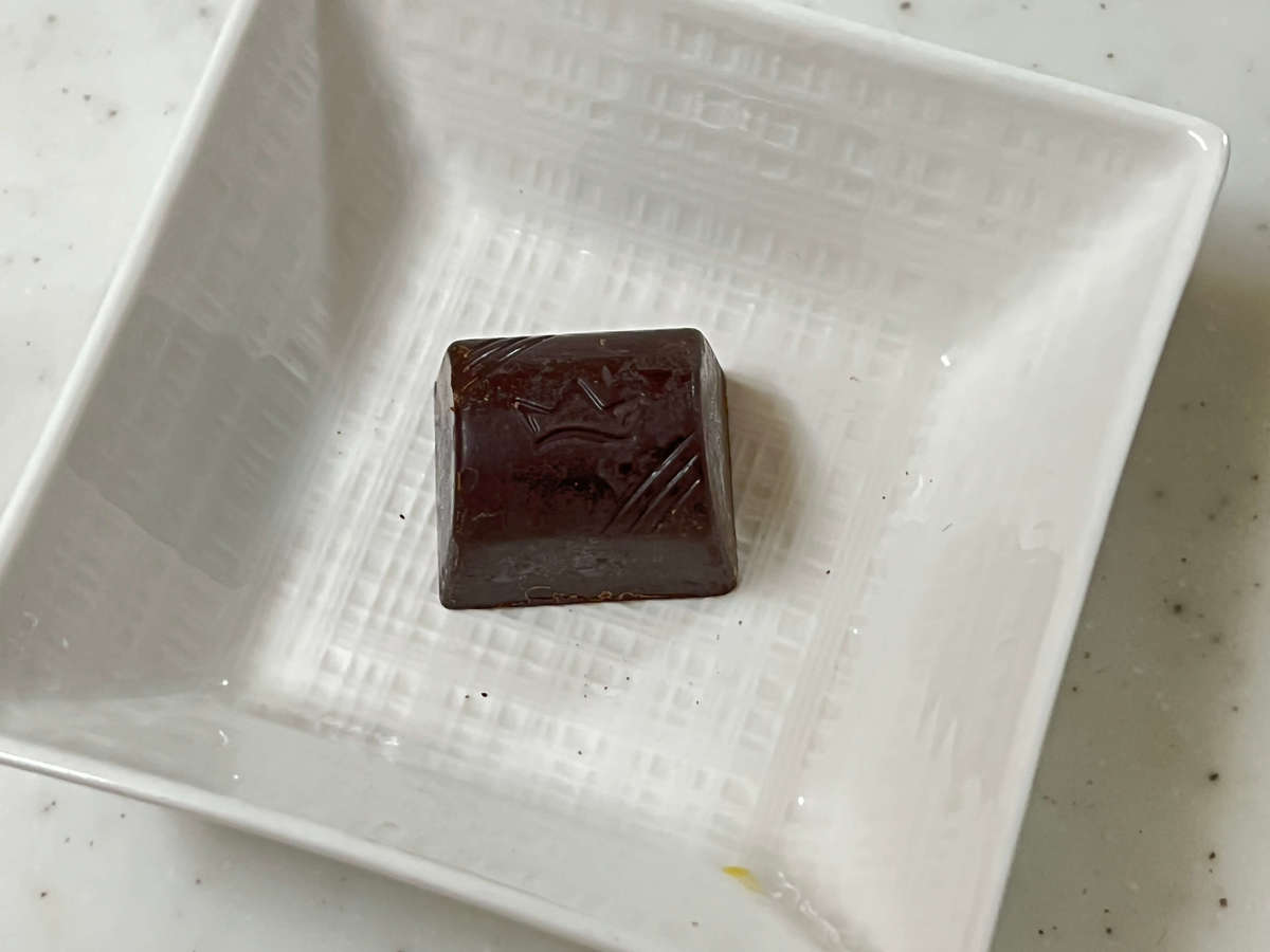 見た目はダークチョコのような濃い色合い。噛むと中からジュワっとお酒が広がります・・・・・・が!ワインよりもブランデーの香りが強め。これは間違いなくお酒好きにウケる味!チョコレートの内側にコーティングされているシュガーのシャリシャリとした食感と甘さが、チョコレートのほろ苦さとブランデー&ワインの大人な風味を中和して、口の中が幸せでいっぱいになりますよ♪