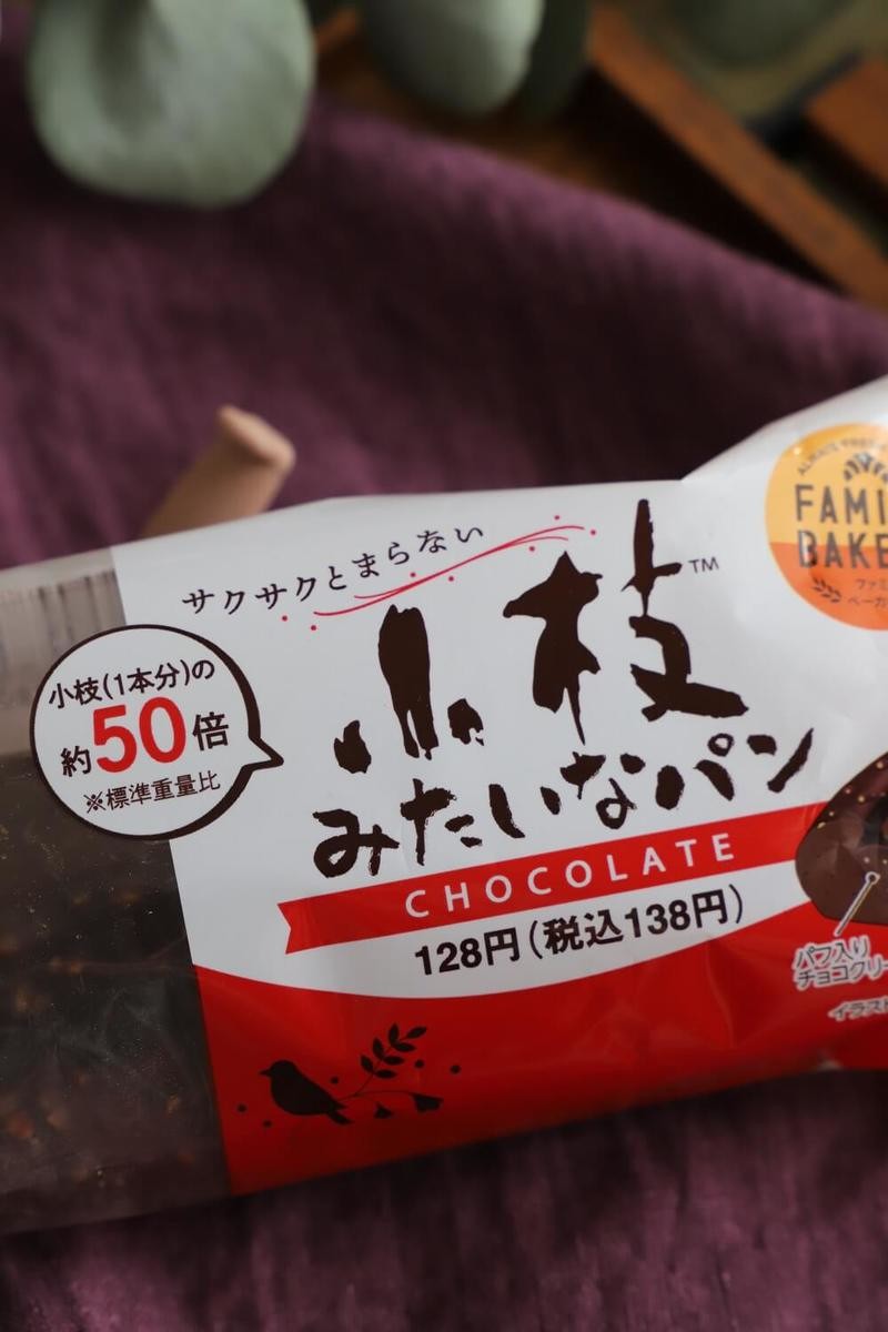 「森永製菓「小枝」のおいしさを表現した菓子パンです。アーモンド付きのチョコ味のパン生地に、ザクザク食感のパフ入りチョコクリームをサンドしチョコでコーティングしました。」