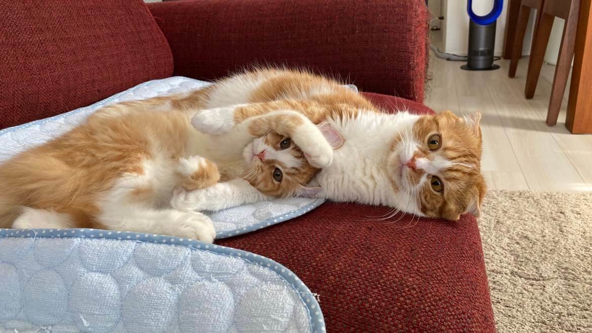 飼い主はいきさん。ケミちゃんは保護猫カフェから、サクラちゃんは横浜で保護された猫なのだそうです。1枚目の写真は、屋上にでようか思案中の2匹。2枚目の写真はおなか丸出しのフィガロちゃんです。居心地の良さそうなポーズですね。